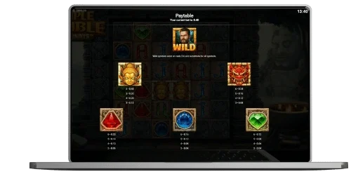 Instead of paylines, the game has 46,656 ways to win by matching symbols on adjacent reels. Carved stone symbols are not worth much, but golden masks and jewelled artefacts are. Three or more matching symbols pay out.